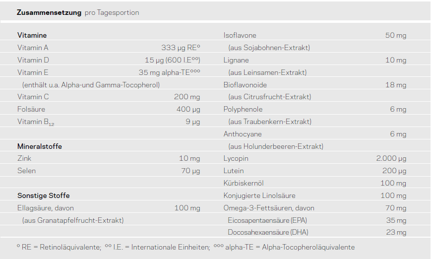 Pflanzliche Öle (Sonnenblumenöl, Sojaöl, konjugierte Linolsäure-haltiges Distelöl, Kürbiskernöl, Kokosöl in veränderlichen Gewichtsanteilen), Gelatine (aus Rind), Ellagsäure-haltiger Granatapfelfrucht-Extrakt (aus Punica granatum), Feuchthaltemittel Glycerin, L-Ascorbinsäure, Isoflavon-haltiger Sojabohnen-Extrakt (aus Glycine max.), Fischöl, Zinkgluconat, DL-alpha-Tocopherylacetat, Lignan-haltiger Leinsamen-Extrakt (aus Linum usitatissimum), Lycopin (aus Solanum lycopersicum), Emulgator Soja-Lecithine, Anthocyan-haltiger Holunderbeeren- Extrakt (aus Sambucus williamsii), Bioflavonoid-haltiger Citrusfrucht-Extrakt (aus Citrus sp.), gemischte Tocopherole, Trennmittel Siliciumdioxid, Farbstoff Eisenoxide, Polyphenol-haltiger Traubenkern-Extrakt (aus Vitis vinifera), Carotin-haltiger Palmfrucht-Extrakt (aus Elaeis guineensis), Pteroylmonoglutaminsäure, Lutein-haltiger Tagetes erecta-Extrakt, Natriumselenat, Cholecalciferol, Cyanocobalamin
