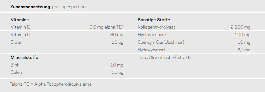 Wasser, Kollagenhydrolysat (aus Rind), Orangensaftkonzentrat, Stabilisator Glycerin, Maracujasaftkonzentrat, Säuerungsmittel Citronensäure, Hydroxytyrosol-haltiger Olivenfrucht-Extrakt (aus Olea europaea), Natrium-L-ascorbat, Natriumhyaluronat, Coenzym Q10, Konservierungsstoff Kaliumsorbat, DL-alpha-Tocopherylacetat, Zinksulfat, Natriumselenat, Süßungsmittel Acesulfam K und Sucralose, Aroma, D-Biotin