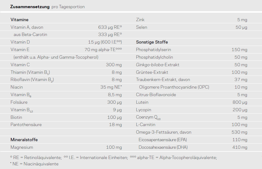 Dextrose, Maltodextrin, Fischöl, Magnesiumsalze der Zitronensäure, Gelatine (aus Rind), Sojaöl, L-Ascorbinsäure, Säuerungsmittel Citronensäure, Orangenfruchtpulver, Feuchthaltemittel Glycerin, Soja-Lecithinkonzentrat mit Phospholipiden (aus Glycine max), Stabilisator Gummi arabicum, Aroma, L-Carnitin-L-Tartrat, DL-alpha-Tocopherylacetat, wässriger Extrakt aus Grünteeblättern (aus Camellia sinensis), Ginkgo biloba-Blatt-Extrakt, Emulgator Mono- und Diglyceride von Speisefettsäuren, Nicotinamid, OPC-haltiger Traubenkern-Extrakt (aus Vitis vinifera), Zinkgluconat, Süßungsmittel Acesulfam K, Calcium-D-pantothenat, Thiaminmononitrat, Pyridoxinhydrochlorid, Antioxidationsmittel stark tocopherolhaltige Extrakte, Emulgator Soja-Lecithine, gemischte Tocopherole, Riboflavin, Farbstoff Eisenoxide, Bioflavonoid-haltiger Citrusfrucht-Extrakt (aus Citrus sp.), Coenzym Q10, Beta-Carotin, Farbstoff Kupferkomplexe der Chlorophylle und Chlorophylline, Lutein-haltiger Tagetes erecta-Extrakt, Retinylacetat, Pteroylmonoglutaminsäure, Lycopin (aus Solanum lycopersicum), Natriumselenat, D-Biotin, Cholecalciferol, Cyanocobalamin